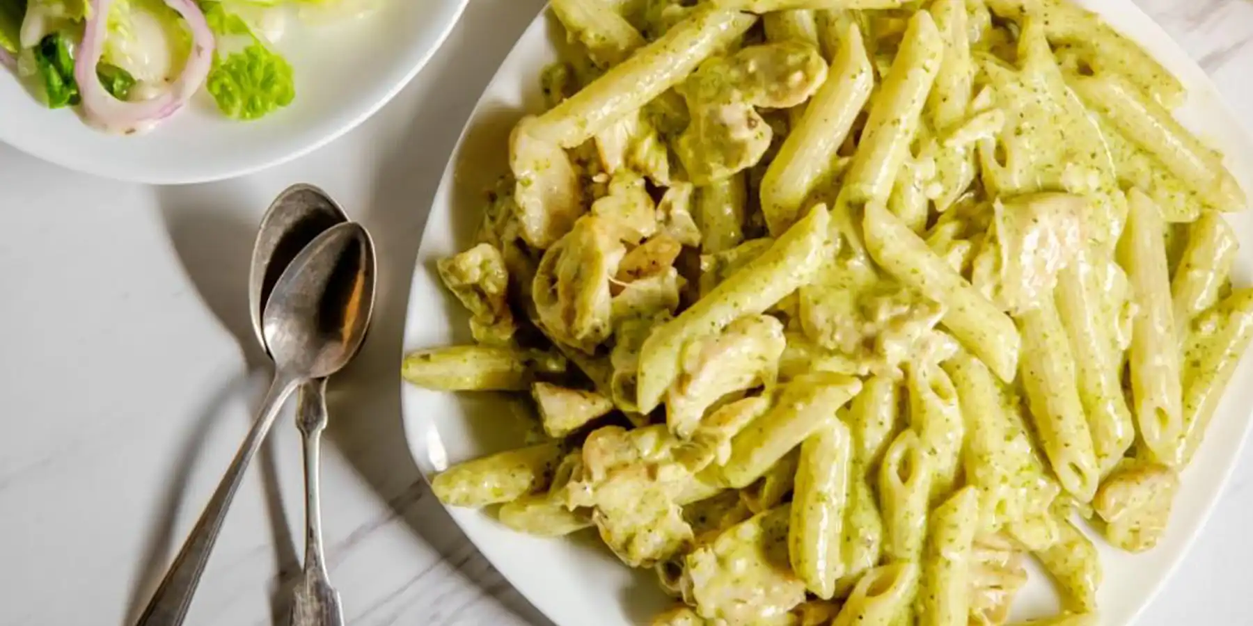 - Turn the stove down to low heat. Slowly add heavy whipping cream while constantly stirring into the roux mix. Add basil pesto sauce and oregano.