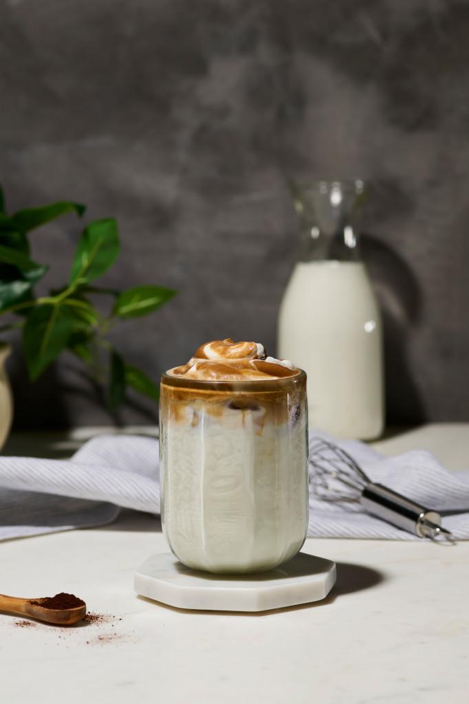 1. To make whipped cream, use a hand mixer to whisk the heavy cream in a medium bowl until stiff peaks form. Add sugar and vanilla extract and blend again briefly to combine. Place in refrigerator while you make the whipped coffee.
