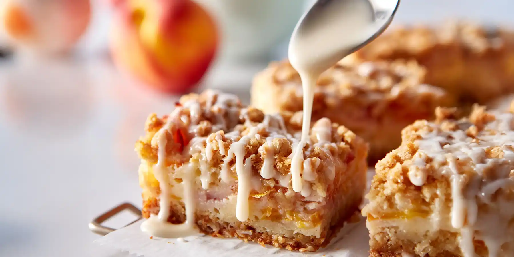 - Pour the Peach filling over the Crumble. Evenly distribute the remaining Crumble on top of the Peaches.