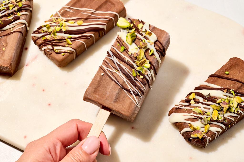 - Drizzle popsicles with melted chocolate as desired and sprinkle with chopped pistachios